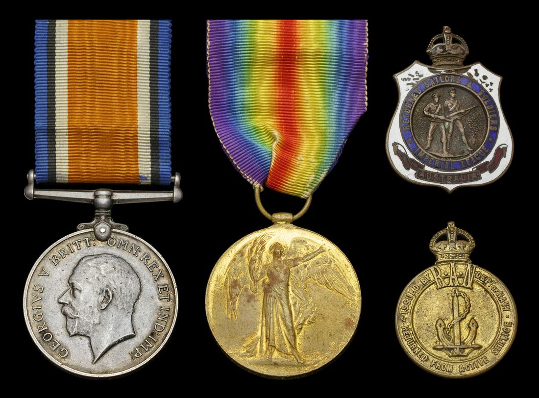 The Royal Australian Navy Brigade were primarily the police force of the Australian coast employed in a variety of tasks, however a small number of men were employed in a more active role in theatres of was which enabled the award of the Victory Medal; Sold together with Royal Australian Navy returned from active service badge numbered (2698) and Returned Sailor's & Soldiers Imperial League badge, numbered (42149)