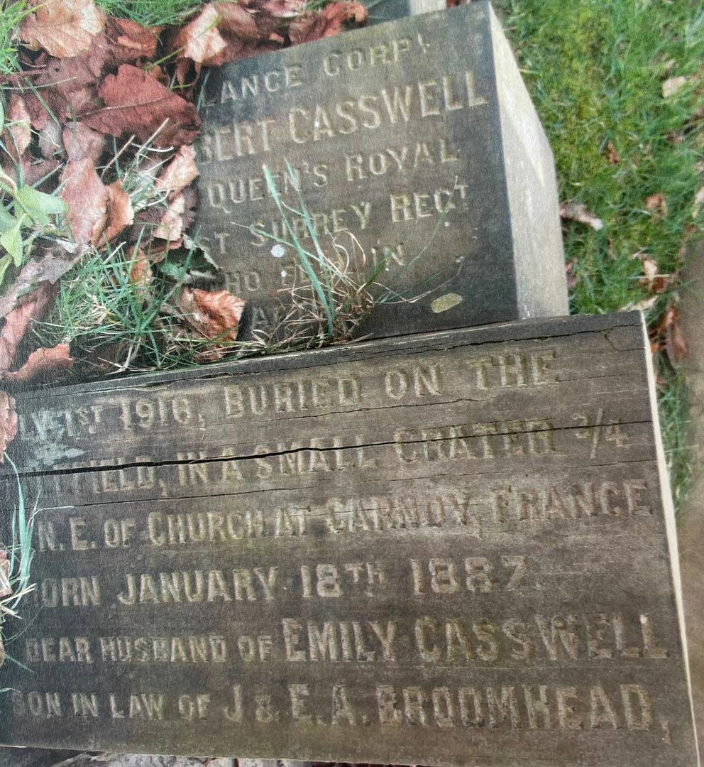 'Lance Corpl. Herbert Casswell 7th Queen's Royal West Surrey Regt. Who fell in Battle July 1st 1916, buried on the battlefield, in a small crater 3/4 N.E. of Church at Carnoy, France.'