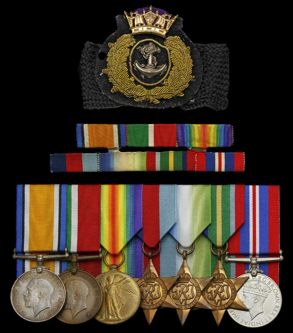 British War Medals 1914-20 (S. Jones. A.B. M.F.A.); Mercantile Marine War Medal 1914-18 (Sidney Jones); Victory Medal 1914-1919 (S. Jones. A.B. M.F.A.); 1939-45 Star; Atlantic Star; Pacific Star; War Medal 1939-45, mounted court-style for wear, sold together with a riband bar and cap badge, good very fine (7)