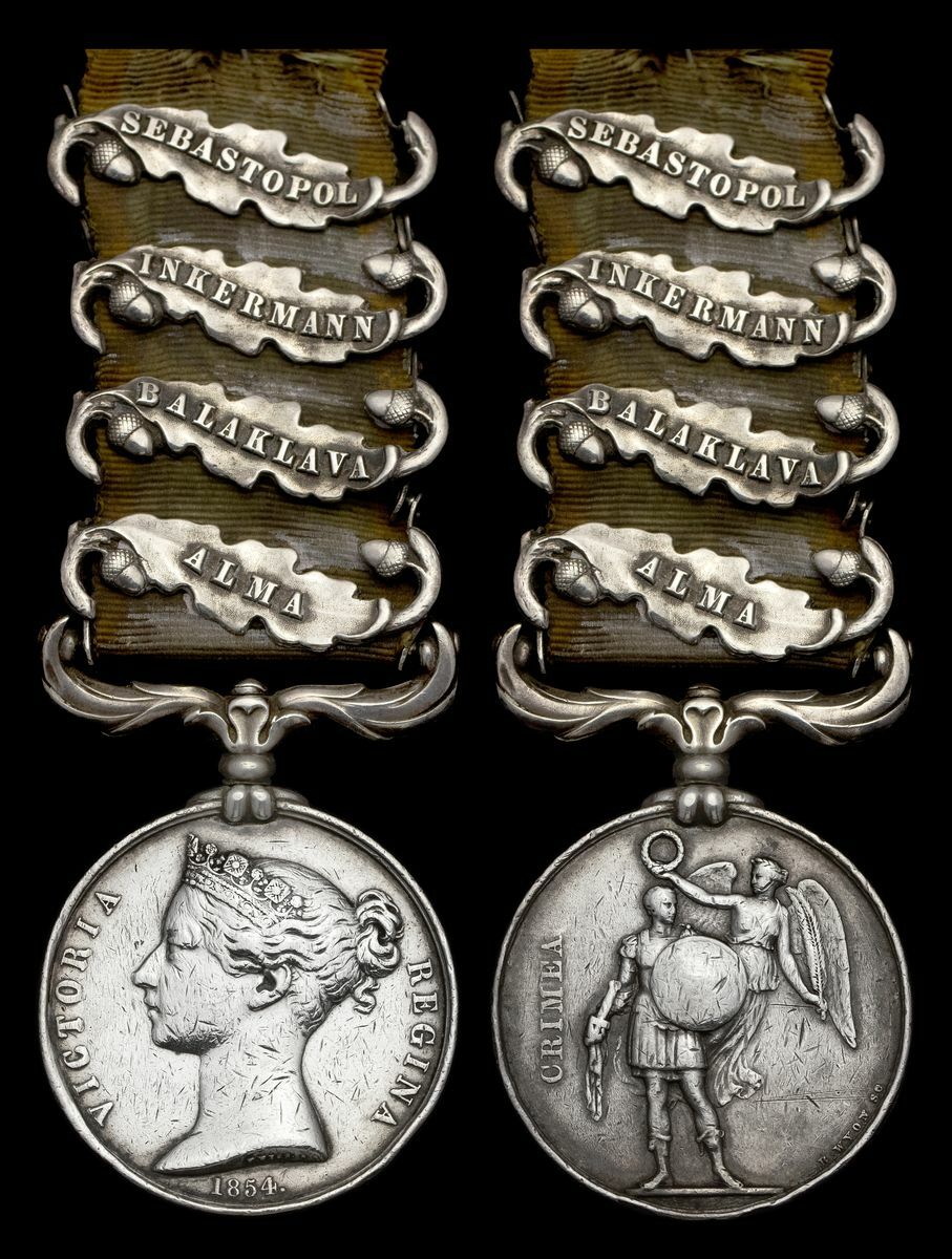 Crimea 1854-56, 4 clasps, Alma, Balaklava, Inkermann, Sebastopol (Pte. 3915 Jn. Gudridge, 1st Bn. S.F. Gds.), contemporarily engraved naming in upright capitals, tape residue on riband, contact wear, naming slightly obscured in places due to edge bruising, about very fine