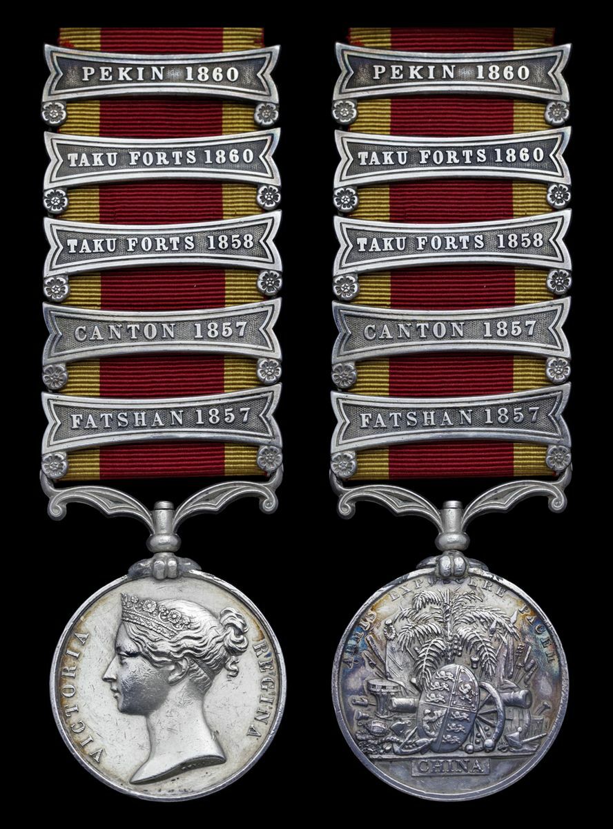 China 1856-60, 5 clasps, Fatshan 1857, Canton 1857, Taku Forts 1858, Taku Forts 1860, Pekin 1860, unnamed as issued, suspension sometime re-affixed, nearly very fine