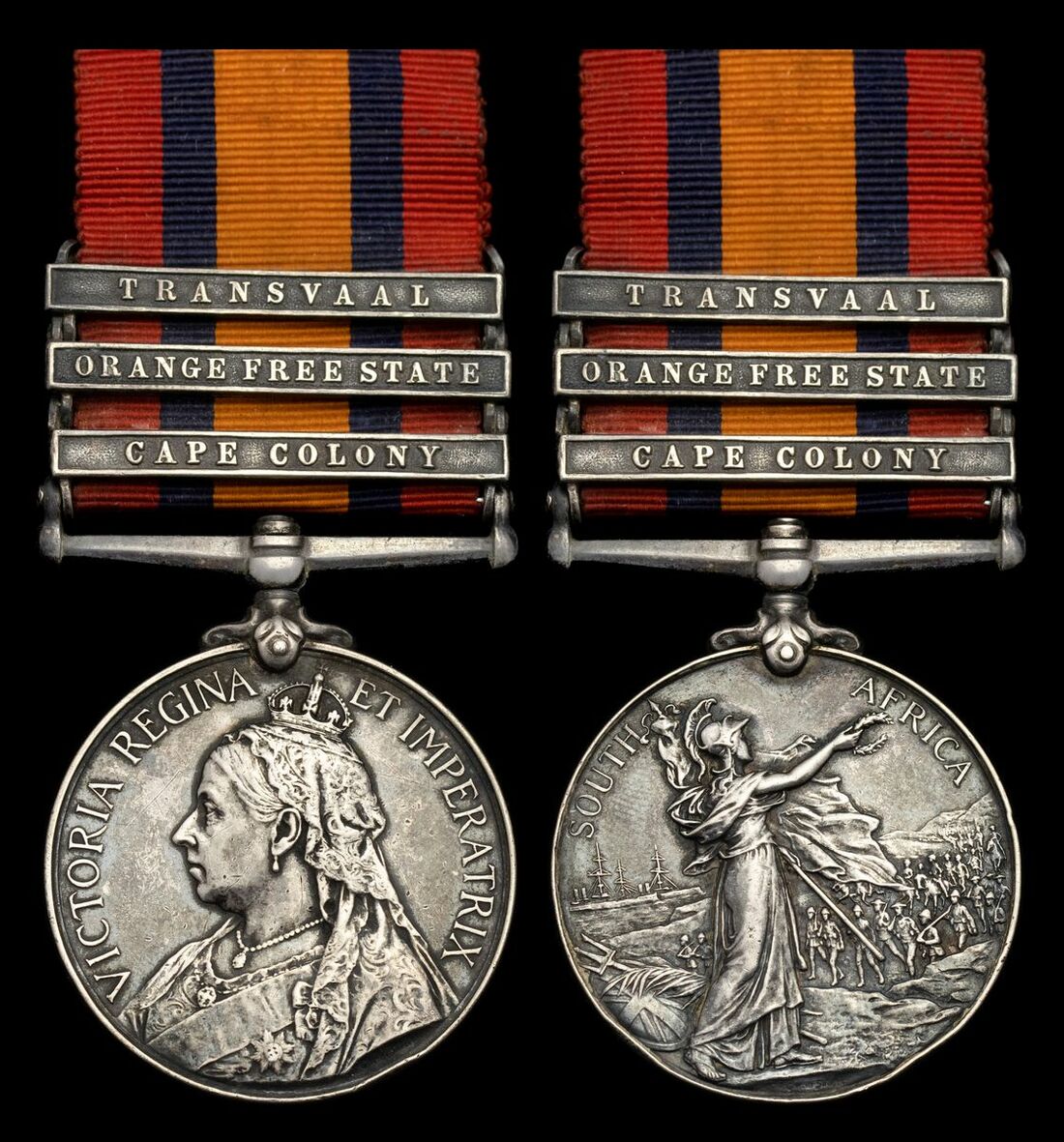 Queen's South Africa 1899-1902, 3 clasps, Cape Colony, Orange Free State, Transvaal (5059 Pte. F. Thornthwaite. 1st Rl: Dragoons.), mounted as worn, light edge bruising and contact wear, very fine