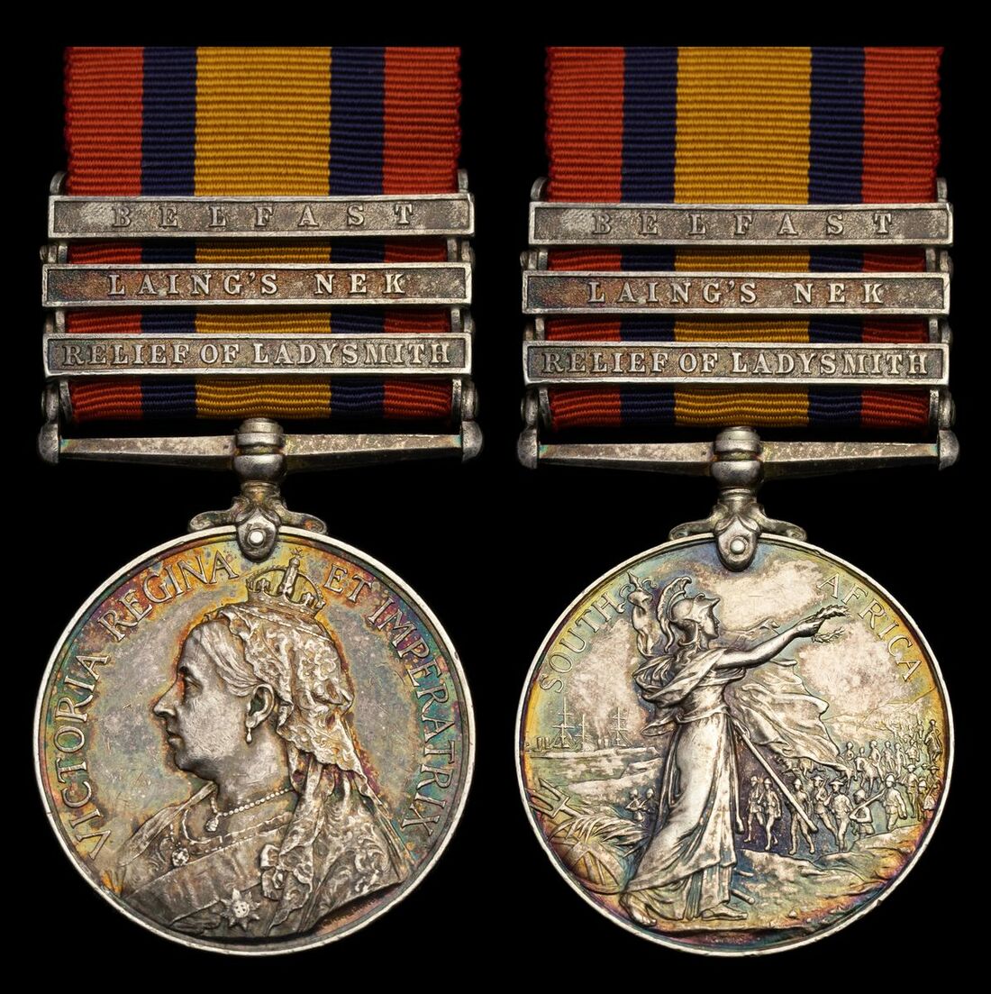 (x) Queen's South Africa 1899-1902, 3 clasps, Relief of Ladysmith, Laing's Nek, Belfast (4129 Pte W. Ross. Gordon Highrs:), lightly toned, good very fine
