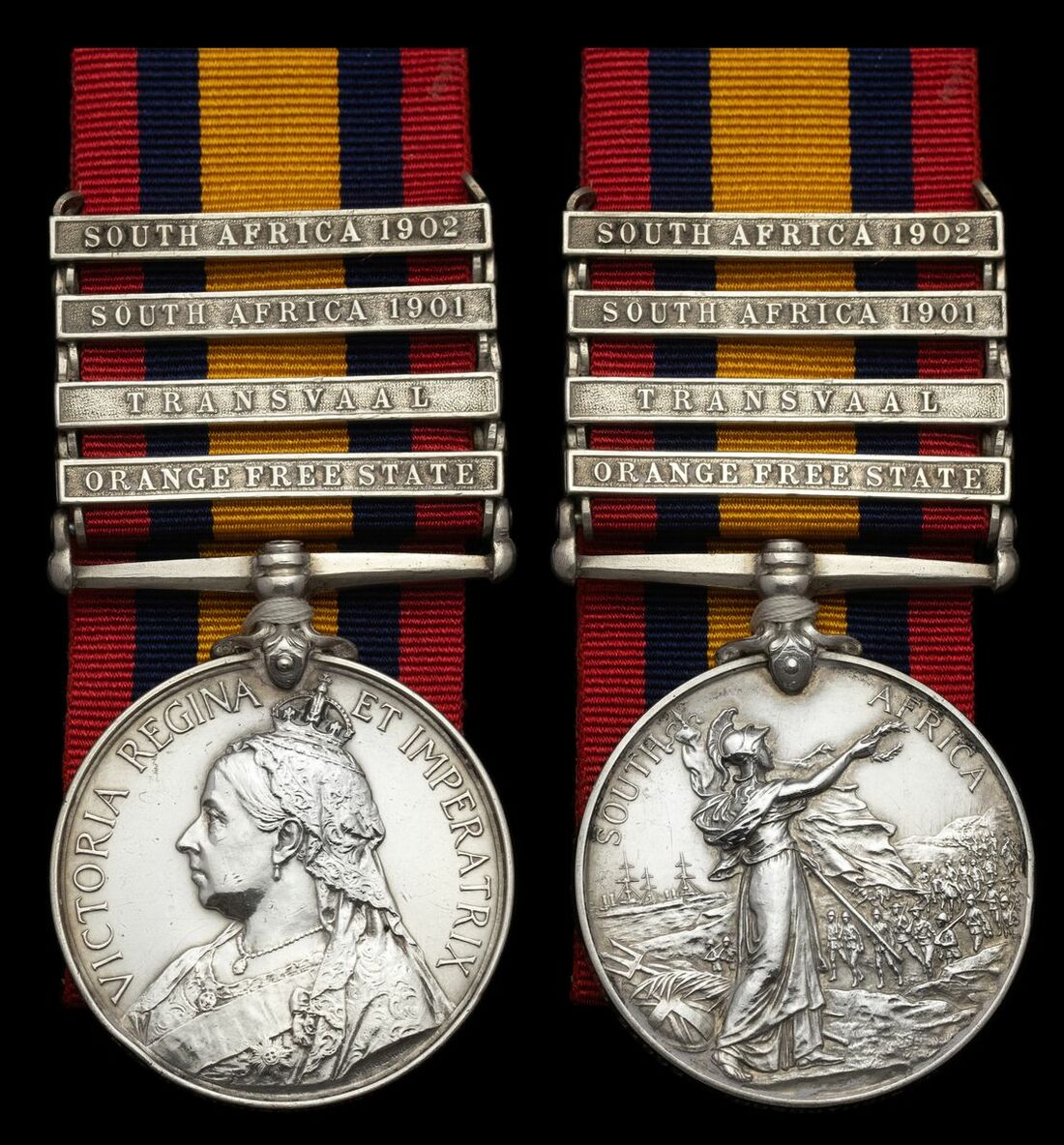 Queen's South Africa 1899-1902, 4 clasps, Orange Free State, Transvaal, South Africa 1901, South Africa 1902 (2659 Pte J. Richardson. Scots Gds.), pin between first and second clasps replaced, edge bruise, pitting, very fine