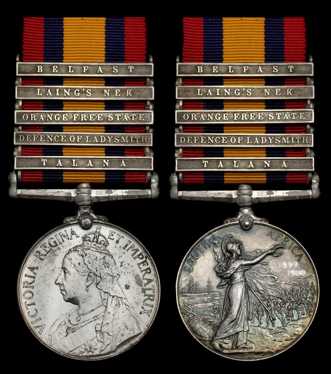 (x) Queen's South Africa 1899-1902, 5 clasps, Talana, Defence of Ladysmith, Orange Free State, Laing's Nek, Belfast (4528. Pte. F. Drummond. 18/hrs.), sometime lacquered, light contact marks, very fine