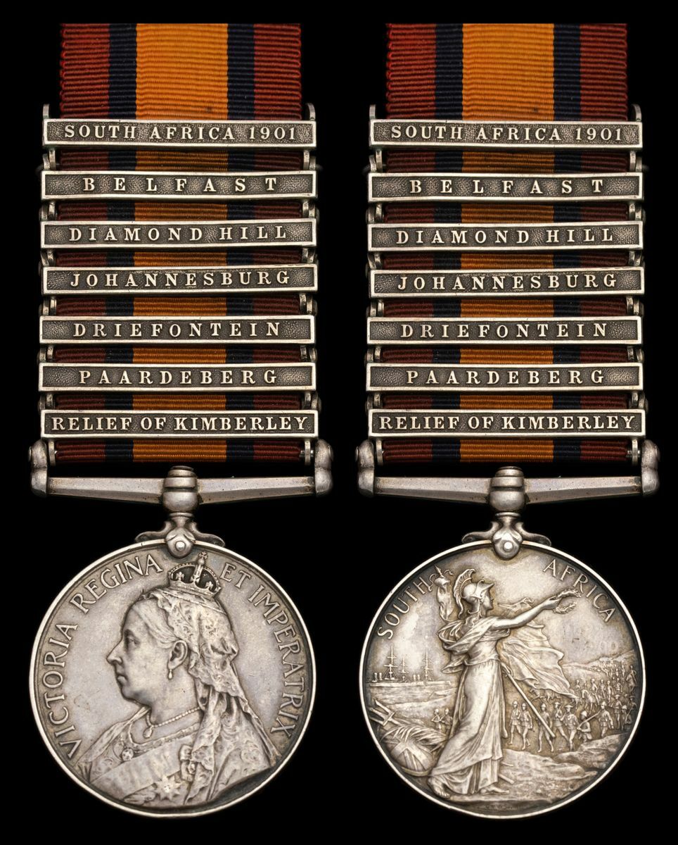 Queen's South Africa 1899-1902, 7 clasps, Relief of Kimberley, Paardeberg, Driefontein, Johannesburg, Diamond Hill, Belfast, South Africa 1901 (3657. Pte. W. J. Mathews. 14/Hrs.), light edge bruising, otherwise good very fine