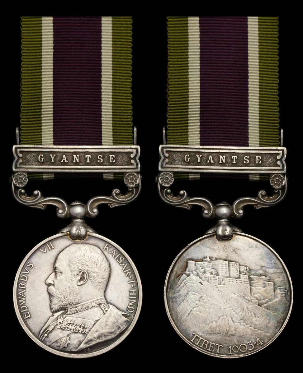 This medal was awarded in both silver and bronze, with silver medals received by combatant troops involved in the operations in or near the Gyantse Fortress from 3 May through 6 July 1904. About 2,600 silver medals were granted to members of the Indian Army.