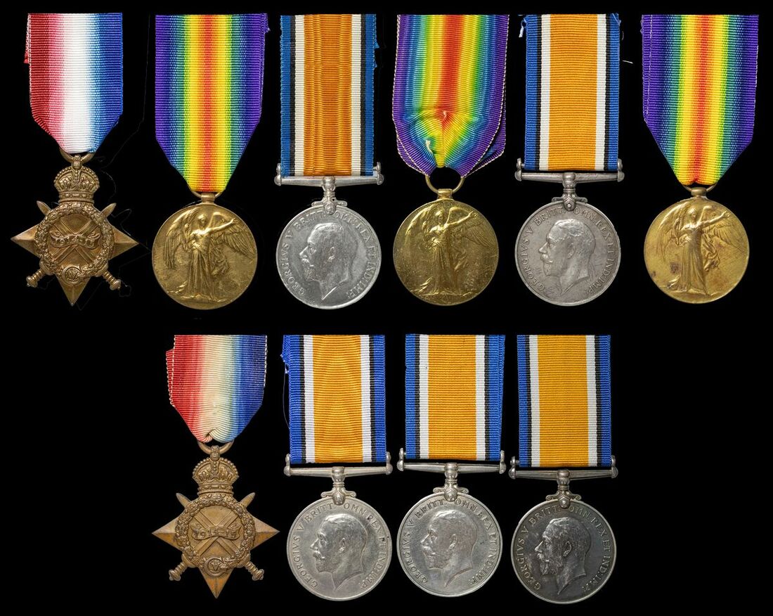 1914-15 Star (Dvr. L. Arnold. S.A.S.C. M.T.); British War Medal 1914-20 (4) (R.M.A. 1826-S- Gr.2 A. E. Gulliver; G-5133 Pte. P. Alloway. The Queen's R.; 1205 Pte. G. Mitchell 4-Lond. R.; 21806 Pte. J. Bewsher. 7-Can. Inf.); Victory Medal 1914-19, bi-lingual issue (Dvr. J. Plaatjes. C.A.H.T.C.), very fine
