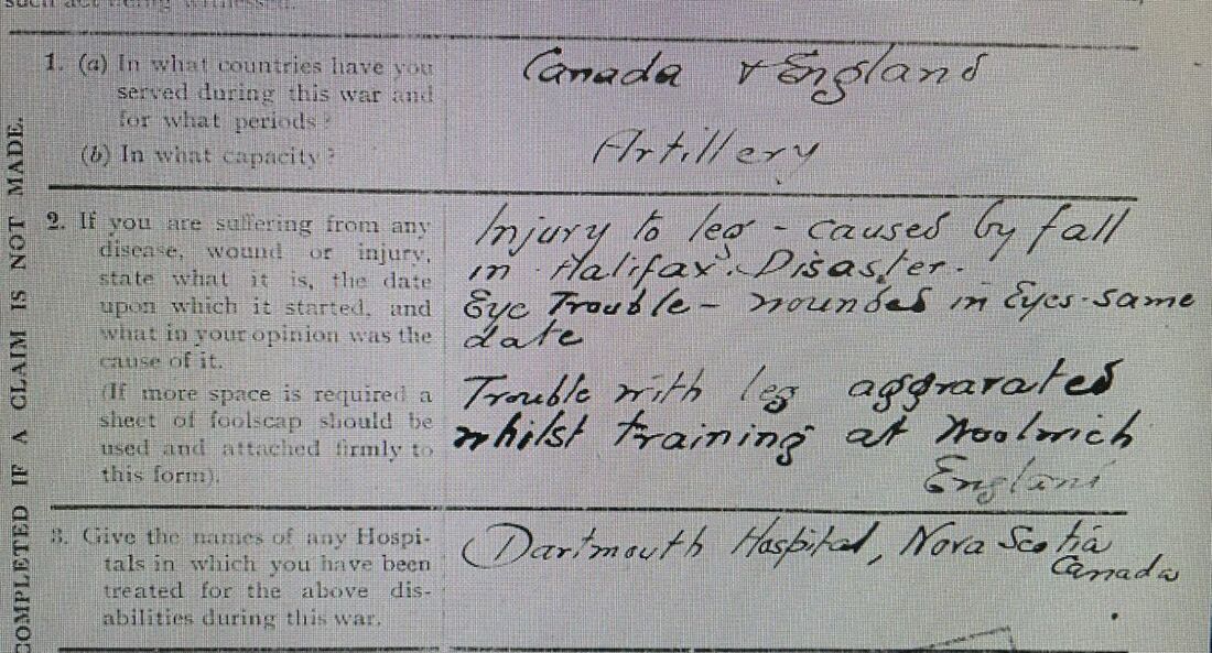 Frank Hood born in 1885 and was an American who lived at 24 Arch Street, South Manchester, Connecticut, was an Efficiency Engineer before the Great War and also lived in St Johnstone when in Scotland. He enlisted at Hartford, Connecticut in October 1917 and served with the Royal Field Artillery and 593 (Home Service) Employment Company, Labour Corps. He underwent a Medical Examination at Dover in January 1919 and reported the fact he suffered wounds to the legs and eyes during the Halifax Explosion in December 1917, being treated at Dartford Hospital, Nova Scotia.