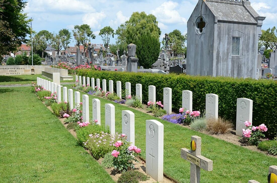 Walter Frank Pearce was born in 1894 in Reading, where he enlisted with the Royal Berkshire Regiment on 17 November 1915. He joined the 8th Royal Berkshire Regiment in France in 1916, and moved up to Bazentin with his unit that September. The men were employed carrying ammunition and bombs from Bazentin to the front line, often done over open ground and under shell fire. Many men were killed or wounded, and at some point Pearce was wounded and taken a prisoner of war by the enemy. He died of his wounds as a German captive on 21 September 1916, only 22 years old, less than a week before they were relieved. He was interred in the Porte-de-Paris Cemetery in Cambrai, alongside other soldiers who died as prisoners; sold together with copied research and negatives of Pearce's headstone and the graves at Porte-de-Paris Cemetery.