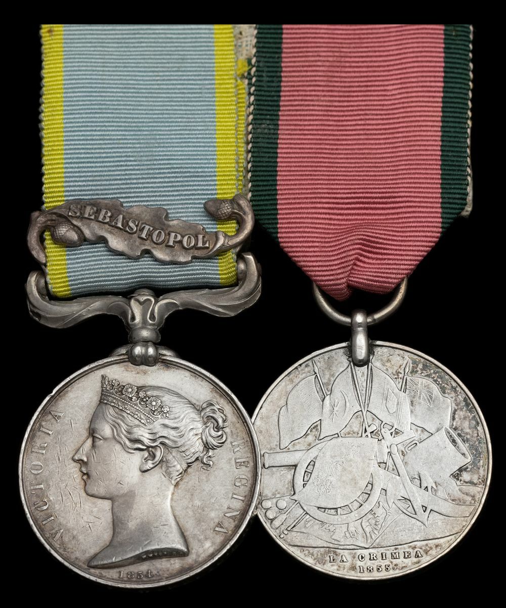 Crimea 1854-56, 1 clasp, Sebastopol (Drum Major Thos. Hoare, 18th Regt.), officially impressed naming; Turkish Crimea 1855, Sardinian issue (Drum Major T. Hoare. 18th R.I. Regt.), depot impressed naming, fitted with replacement ring suspension, contact marks, otherwise nearly very fine (2)