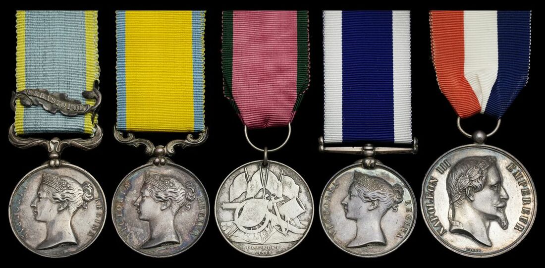 Crimea 1854-56, 1 clasp Sebastopol, unnamed as issed; Baltic 1856, unnamed as issued; Royal Navy L.S. & G.C., V.R. (John Blewitt Chief Btmn in Chge H.M. Coast Gd.); Turkish Crimea, Sardinian Issue; France, Republic, Ministerre de La Marine et Des Colonies, large silver medal, the reverse embossed 'A John Bluett Marin Anglais Services Rendus A La Marine Marchande Francaise 1866', some contact marks, overall very fine (5)