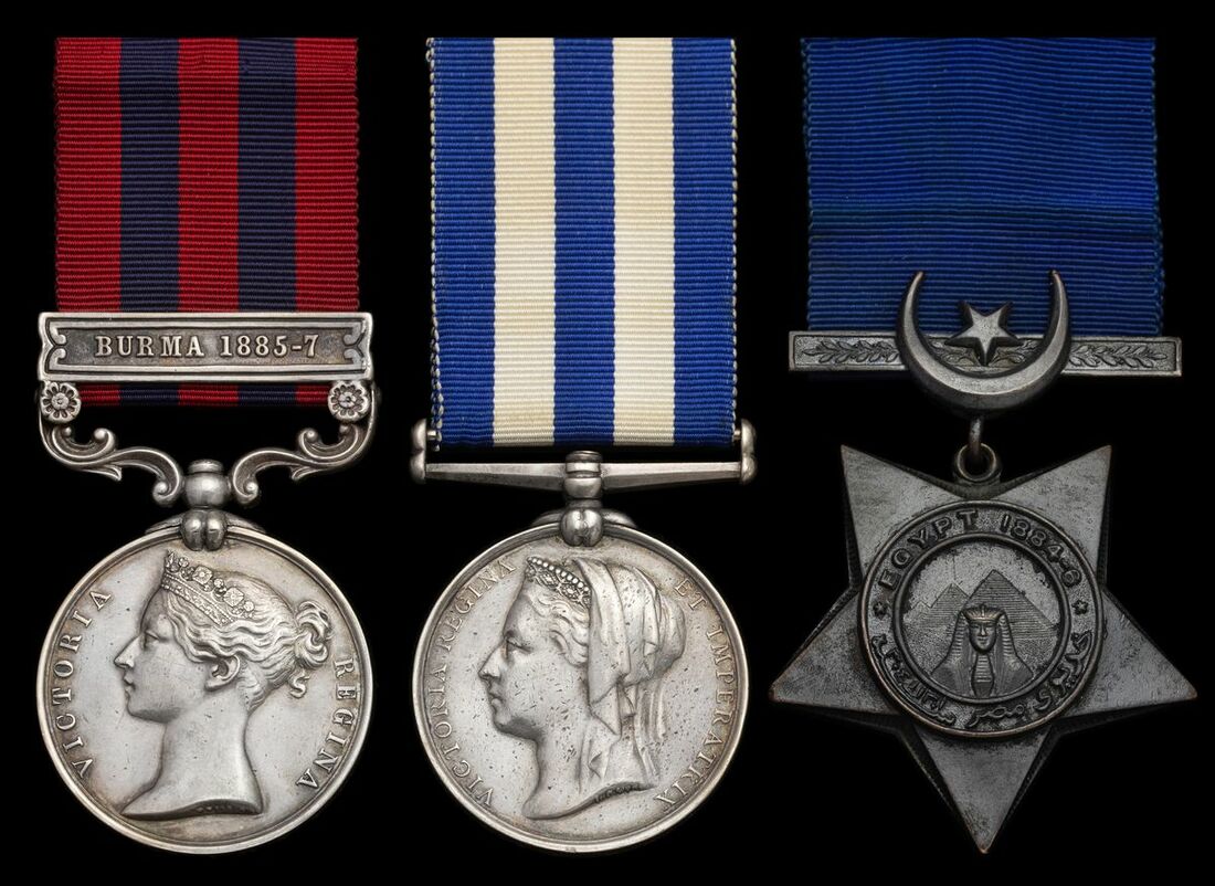 Egypt 1882-89, undated reverse, no clasp (F. C. Smallman, Boy 1 CL. H.M.S. Turquoise.); India General Service 1854-95, 1 clasp, Burma 1885-7 (F. C. Smallman, Ord. H.M.S. Turquoise.); Khedive's Star, dated 1884-6, light contact marks and polishing to the first two, otherwise very fine (3)