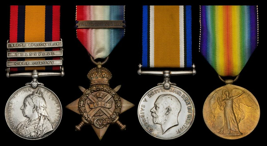 Arthur Chitty served with the 5th Middlesex (Royal Elthorn Militia) in South Africa in 1902 before enlisting with the Royal Berkshires in November of that year. Chitty disembarked at Rouen in August 1914 with the 1st Royal Berkshires, 6th Brigade, 2nd Division and arrived at Mons later that month where the Regiment took an active role in the Battle of Mons. They retreated to the Marne before making their way to Ypres, seeing action at the First Battle of Ypres in October 1814. At the Battle of Loos on 28 September 1915, they were engaged in the quarries attack which resulted in nearly 300 deaths of the unit. Chitty was discharged soon after the battle due to the termination of his engagement together with wounds, likely inflicted at Loos and entitling him to a Silver War Badge; sold together with copied research.