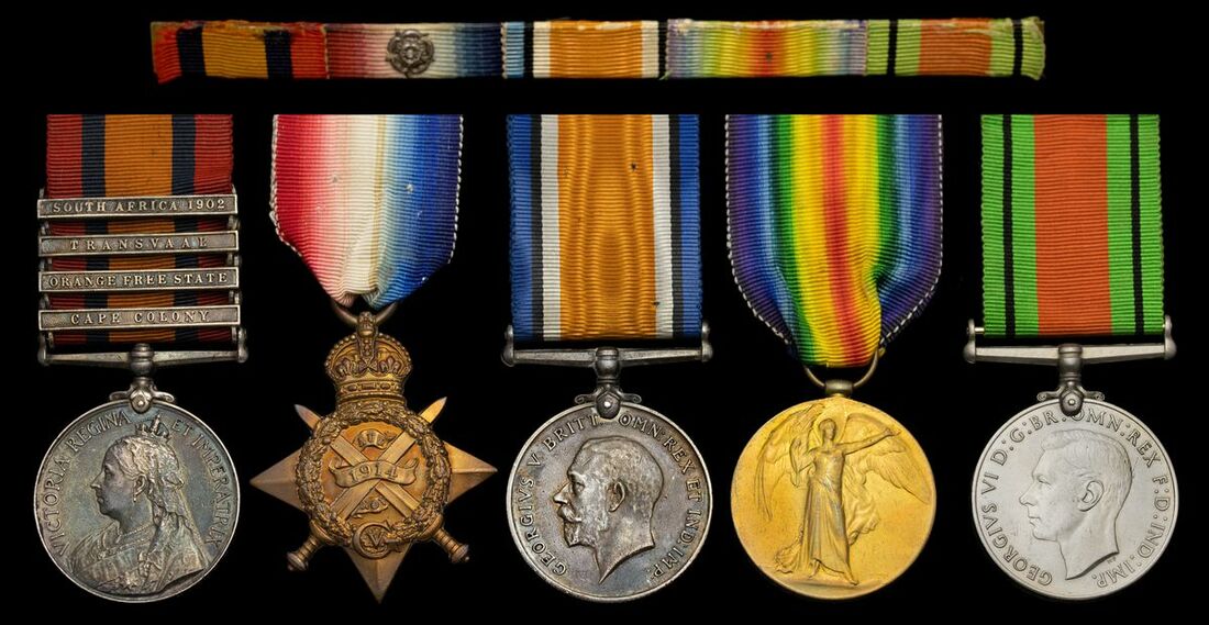 Queen's South Africa 1899-1902, 4 clasps, Cape Colony, Orange Free State, Transvaal, South Africa 1902 (5704 Pte G. Parker. Norfolk Regt); 1914 Star (5704 Pte G. A. Parker. Norf:R.); British War and Victory Medals (5704 Pte. G. A. Parker. Norf. R.); Defence Medal 1939-45, unnamed as issued, sold together with a Royal Norfolk Veterans Association badge, the reverse engraved, Presented to G. A. Parker. for merit 10.11.26.', silver, hallmarked for Birmingham, pitting overall, very fine (5)