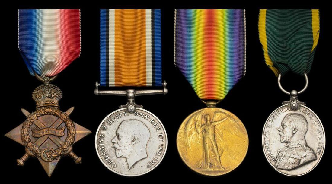 1914-15 Star (1943 L.Cpl E.C.Dunstan. R. Berks: R.); British War and Victory Medals (200208 Pte. E.C. Dunstan. R. Berks. R.); Territorial Efficiency, G.V.R. (5330165 Pte. E.C. Dunstan. 4-R. Berks. R), heavy contact wear, edge bruising, and polishing, good fine to nearly very fine (4)