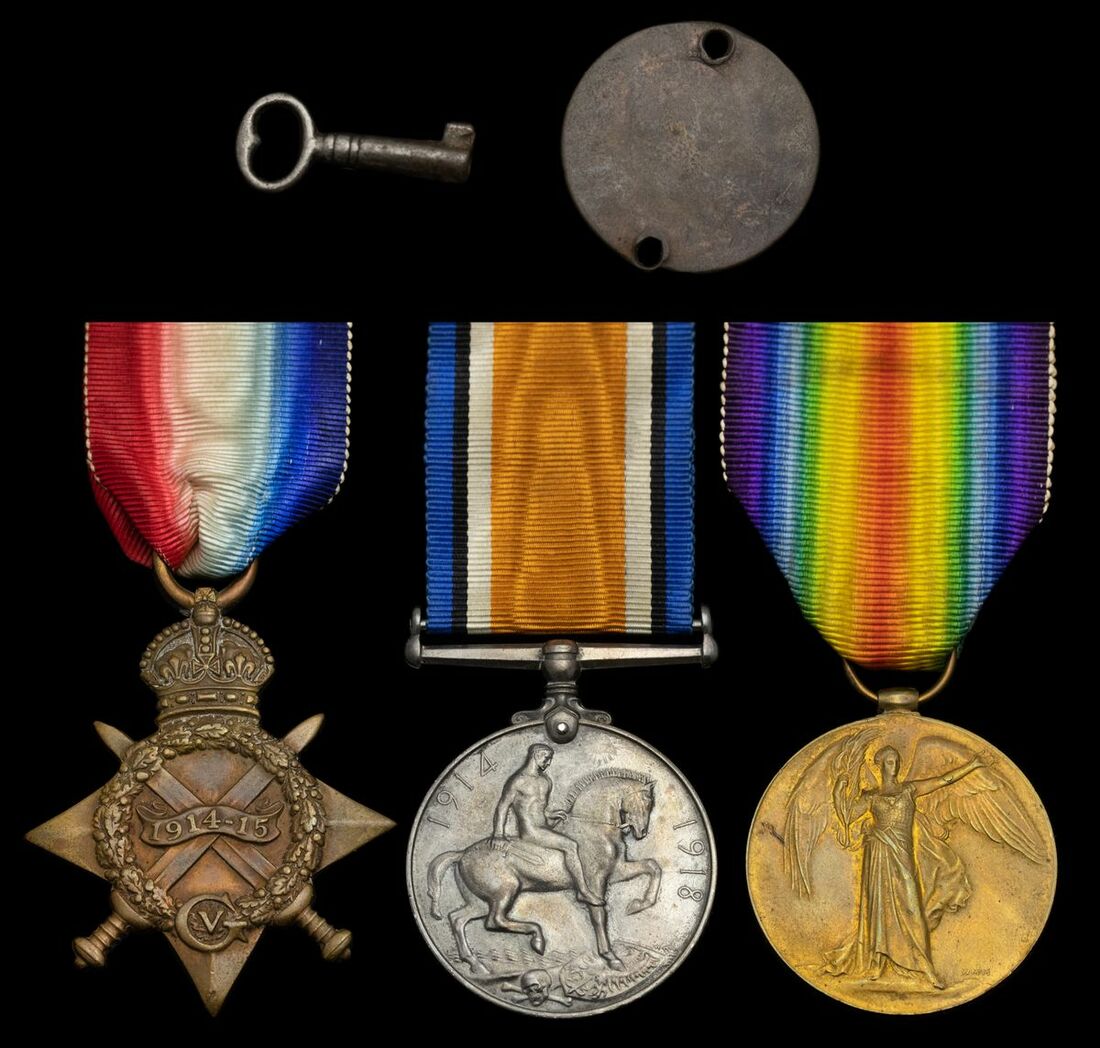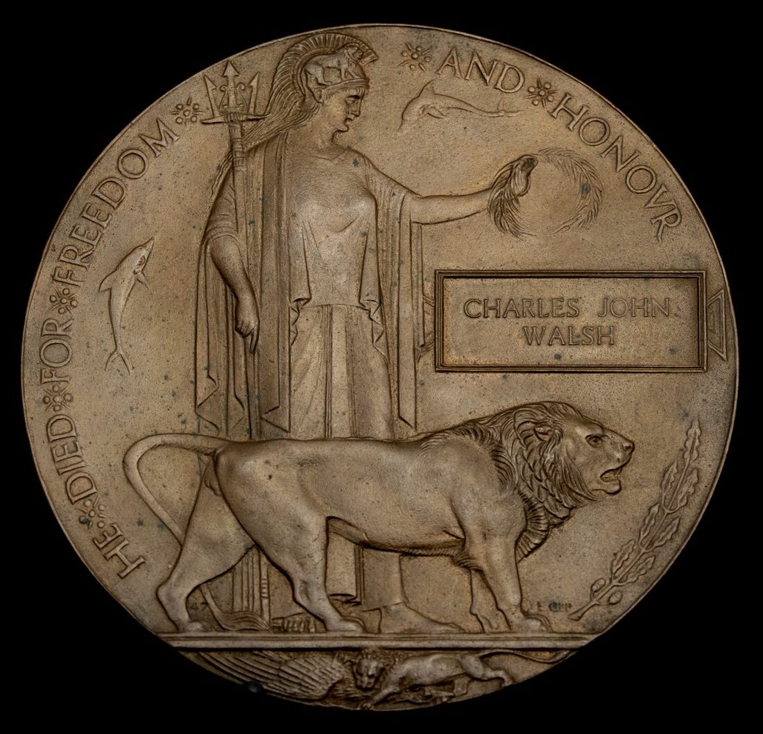 Charles John Walsh was born at Lambeth and enlisted in London. He was killed in action on 7 June 1917 whilst serving with the 23rd Battalion and is buried in the Voormezeele enclosure No. 3. He was the husband of Mrs. A. L. C. Rockhill (formerly Walsh), of 24 Alberta St., Penton Place, Walworth, London; sold together with a named metal identity disc.