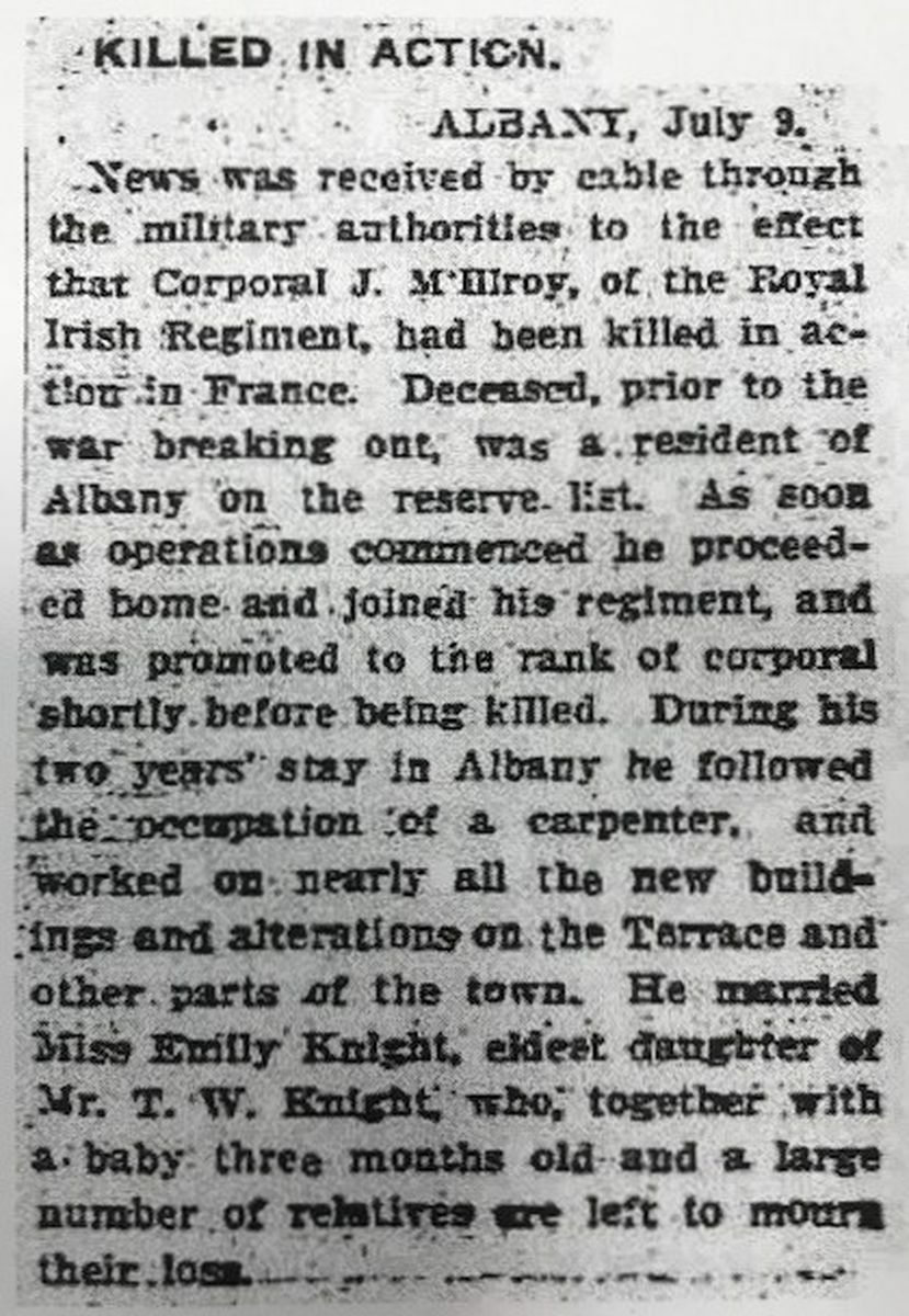 John McIlroy was born in Belfast. When the Great War broke out he was living in Albany, Western Australia and proceeded home to enlist in Belfast. He went overseas to France on 22 April 1915 and was killed in action whilst serving with the 2nd Battalion Royal Irish Rifles on 16 June 1915 and is commemorated on the Ypres (Menin Gate) Memorial. He was the son of David and Catherine Geraldine McIlroy of Blackstock, South Carolina, U.S.A. and the husband of Emily Hester McIlroy of Cuthbert St., Albany, Western Australia.