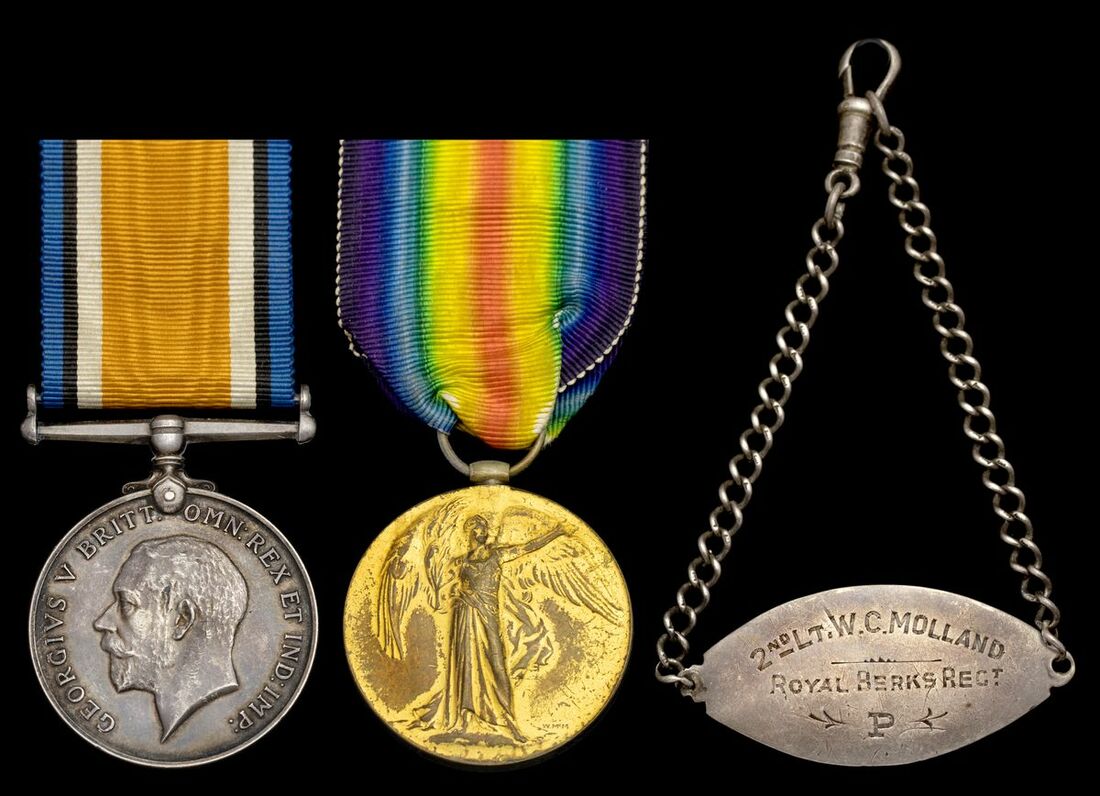 Molland was made Acting Captain in September but relinquished the rank in February 1919, joining the 2/4th Berkshire Regiment at Boulogne. He sailed to Alexandria with them in June and was in the D Company when the Regiment was later disbanded, after which he was posted to the 11th Scottish Rifles. He returned home for demobilisation in February 1920 and relinquished his temporary commission the next month, whereafter he lived in Reading; sold together with a large quantity of comprehensive copied research and silver identification bracelet.