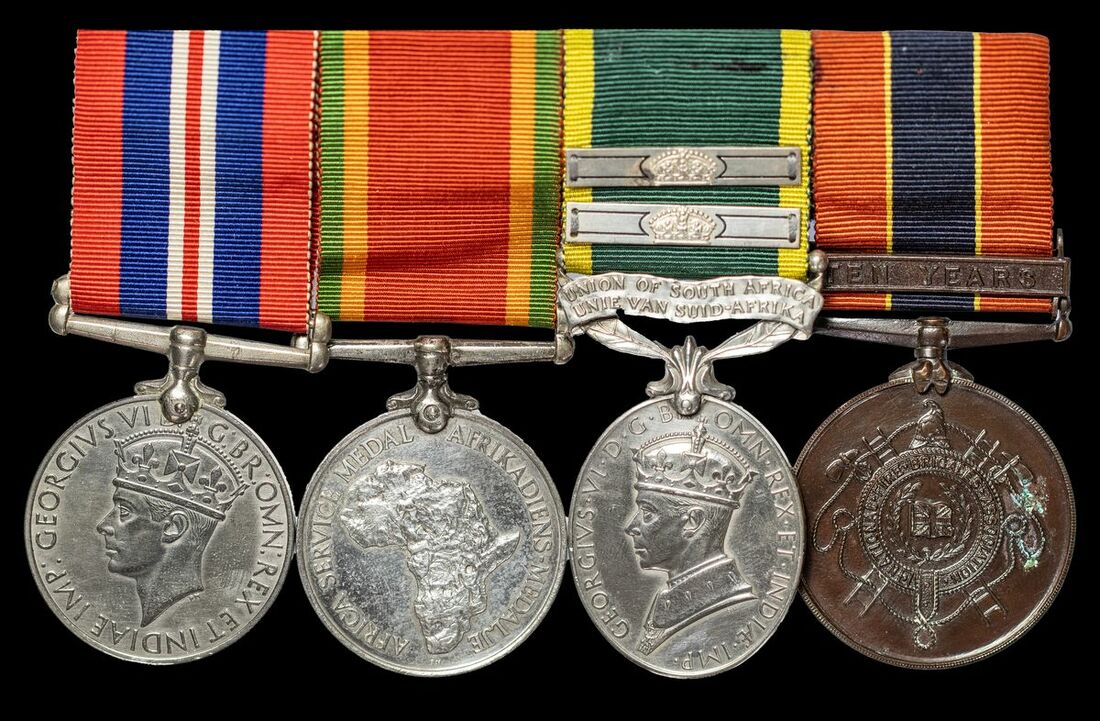 War and Africa Service Medals 1939-45 (20238 D. S. H. Jacobs.); Efficiency Medal, G.VI.R., Union of South Africa, with two Additional Service clasps (No. 20238 C.S.M. D. S. H. Jacobs Kim. R.); National Fire Brigades Association Long Service Medal, 1 clasp, Ten Years (12966 David S. H. Jacobs.), mounted court-style as worn, good very fine (4)