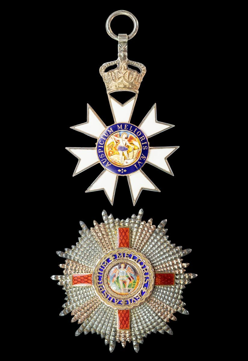 (x) The Most Distinguished Order of St. Michael and St. George, G.C.M.G., Knight Grand Cross set of Insignia, comprising sash Badge silver-gilt and enamel, 114mm including crown suspension x 68mm; breast Star, 88mm, silver and silver-gilt with appliqué centre in gold and enamel, some light enamel chipping, generally good very fine (2)