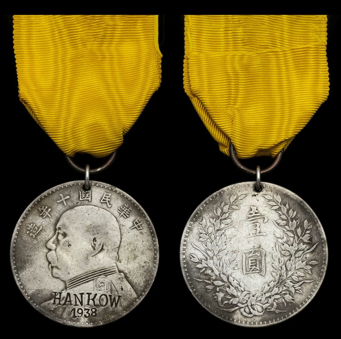 'Sir George Moss KBE (HBM Consul-General, Hankow) presents General Yen Silver Chinese Dollar Medals (engraved Hankow 1938) as appreciation of the British Concession for the assistance rendered by the Royal Navy during the Defence of Hankow. The officer receiving his medal is proably Lieutenant Commander E Neville (CO of GNAT). Behind are Mr Markham (Manager of Arnold's Trading Co.), Rear Admiral Holt (SNO YANGTSE), Paymaster Commander Phrophit and Captain Saunders.'