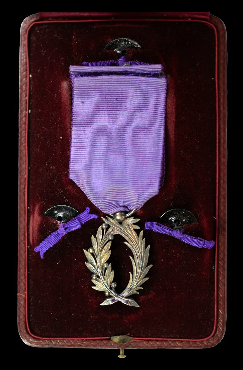 France, Republic, Order of the Academic Palms, Knight's breast Badge in silver and enamel, in case of issue with embossed lid, housing three lapel buttons one of which has a miniature palms attached some light enamel damage to the first otherwise very fine