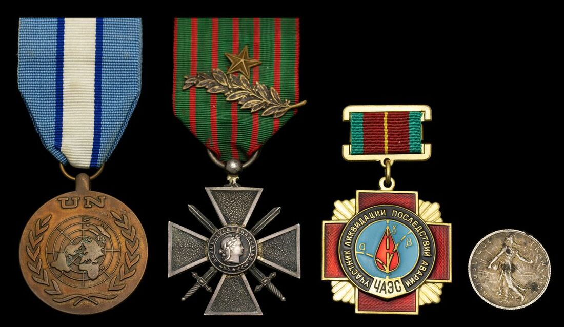 France, Republic Croix de Guerre, reverse dated '1914-1918', fitted with laurel leaf and star, in its case of issue, together with a 1 Franc 1914, an unrelated U.N. Medal for Cyprus, and a Soviet Chernobyl Liquidators Medal, very fine (4)