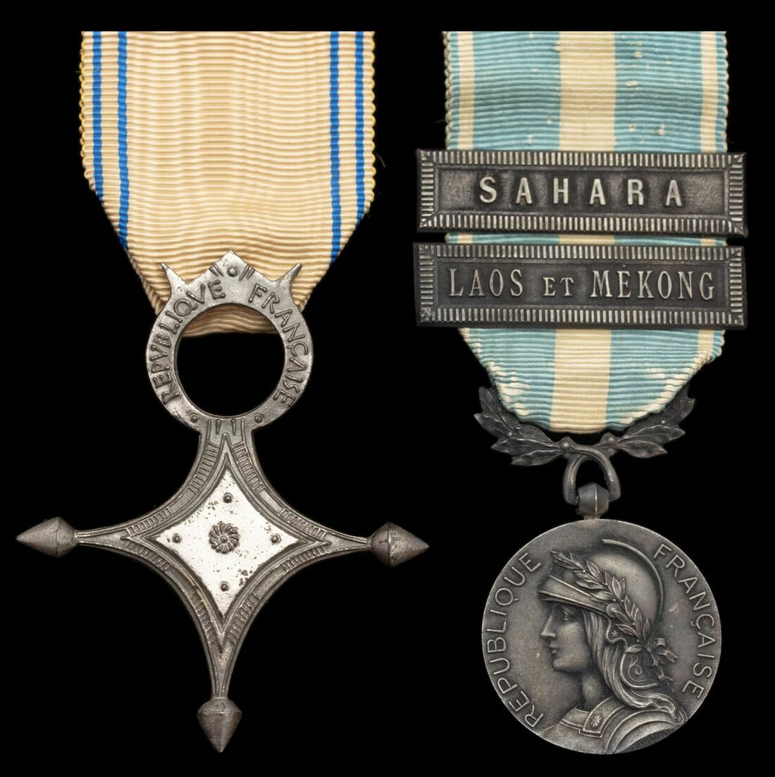 (x) France, Republic, Colonial Medal, 2 clasps, Laos et Mekong, Sahara; Order of Saharan Merit, Knight's breast Badge in white metal, the first deeply toned, otherwise very fine or better (2)