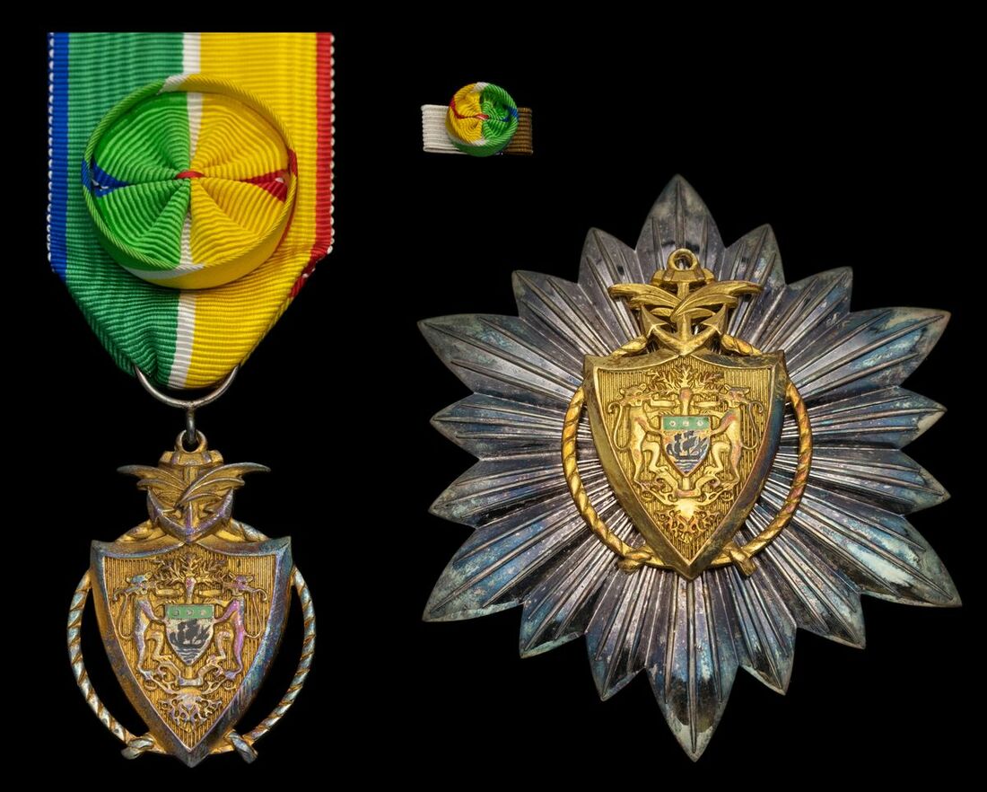 Gabon, Republic, National Order of Merit, Grand Officer's set of Insignia, by Arthus Bertrand, Paris, comprising breast Badge, with rosette, 32mm; breast Star, 68mm, silver, silver-gilt and enamel, reverse cartouche loose, good very fine, with boutonnière and in fitted case of issue