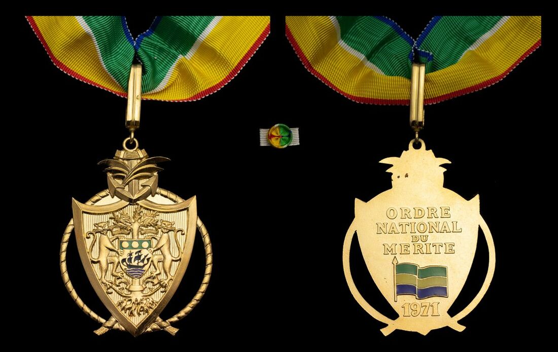 Gabon, Republic, National Order of Merit, neck Badge, by Arthus Bertrand, Paris, 55mm, silver-gilt and enamel, silver mark to loop, good very fine, with neck riband, boutonnière and in fitted case of issue