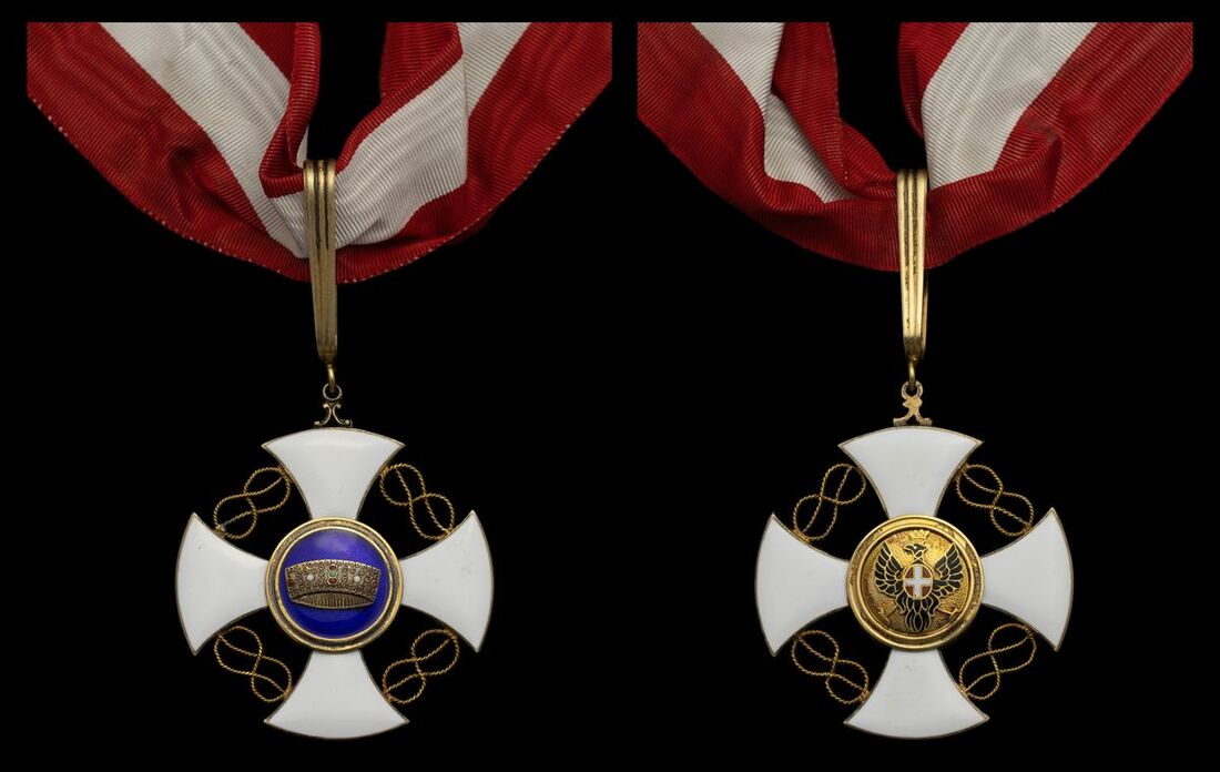 (x) Italy, Kingdom, Order of the Crown, neck Badge, 55mm, gold, silver-gilt and enamel, bottom of lower arm marked '800', very fine, with length of neck riband