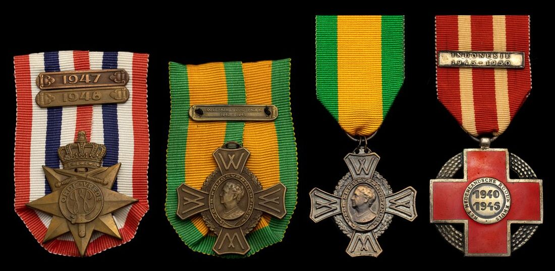 Netherlands, Kingdom, Red Cross Medal 1940-45, 1 clasp, Indonesie 1945-1950, silver and enamel; Service Medal, 2 clasps, 1946, 1947; War Commemorative Cross (2), 1 clasp, Oost-Azie-Zuid-Pacific 1942-1945, very fine (4)