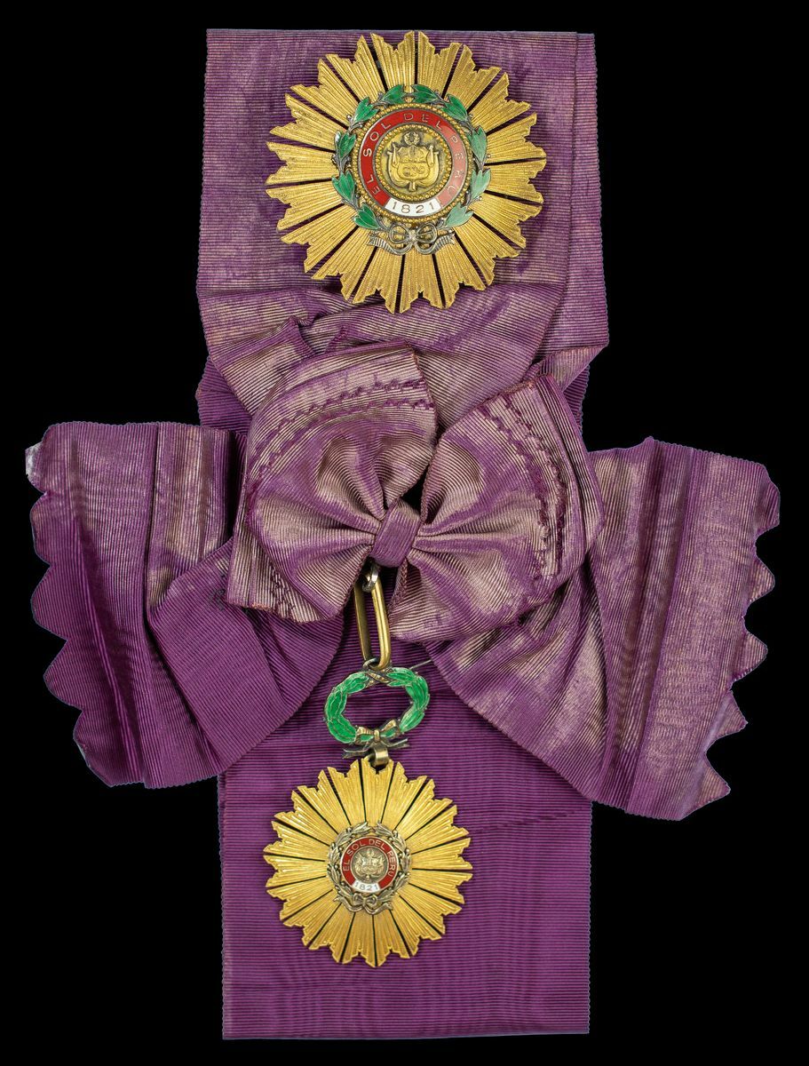 Peru, Republic, Order of the Sun, First Class set of Insignia, by Casa de Moneda, Lima, comprising sash Badge, 88mm including wreath suspension x 58mm; breast Star, 78mm, silver-gilt and enamel, both with maker's cartouche to reverse, very fine, with full sash riband (2)