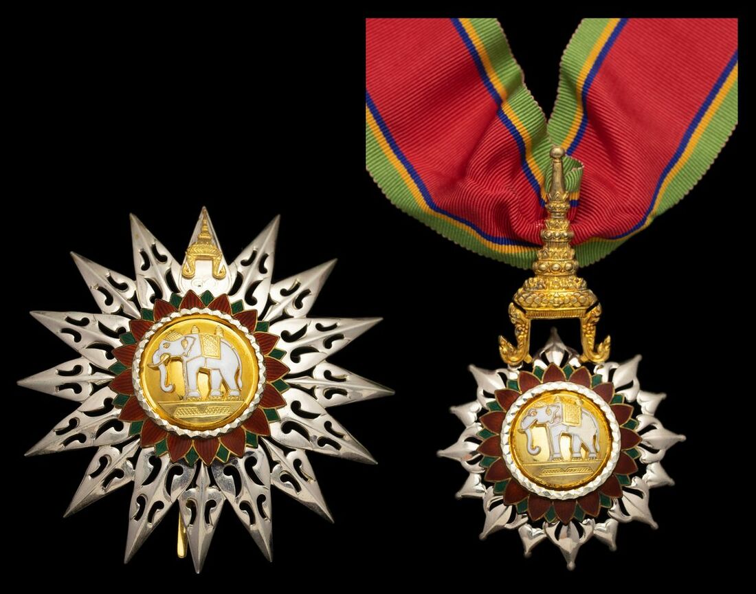 (x) Thailand, Kingdom, Order of the White Elephant, Grand Officer's (2nd Class) set of Insignia, comprising: neck Badge, silver, silver-gilt and enamel, 91mm x 52mm including suspension, numbered '48/1' to the reverse; Star, silver, silver-gilt and enamel, 81mm, numbered '48/1' to the reverse and retaining pin, in its original box of issue, enamel damage to centre of box, signs of repair to neck Badge centre, overall very fine