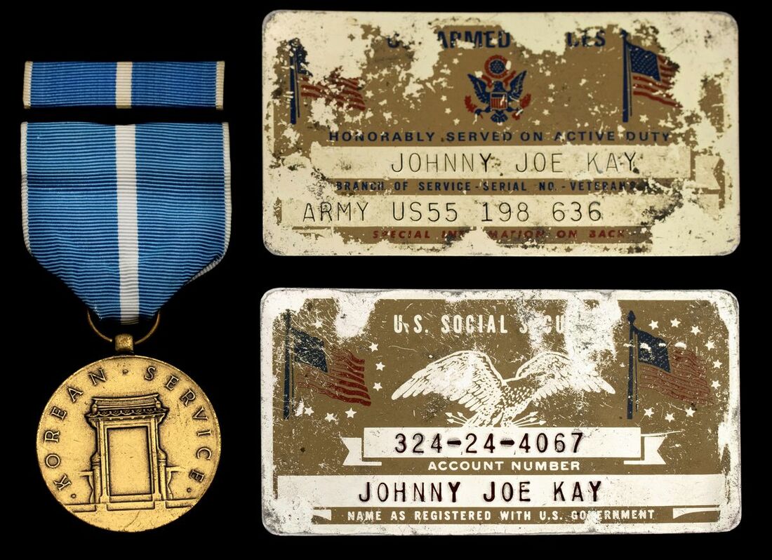 Johnny Joe Kay was born on 17 February 1931; sold together with a riband bar, World War II US stamped steel identity tag embossed 'Kay Johnny D US 55 198636', two private purchase stamped brass Honorable Service ID Plates 'Johnny D Kay Army US 55 198 636', and photo of recipient's Army I.D.
