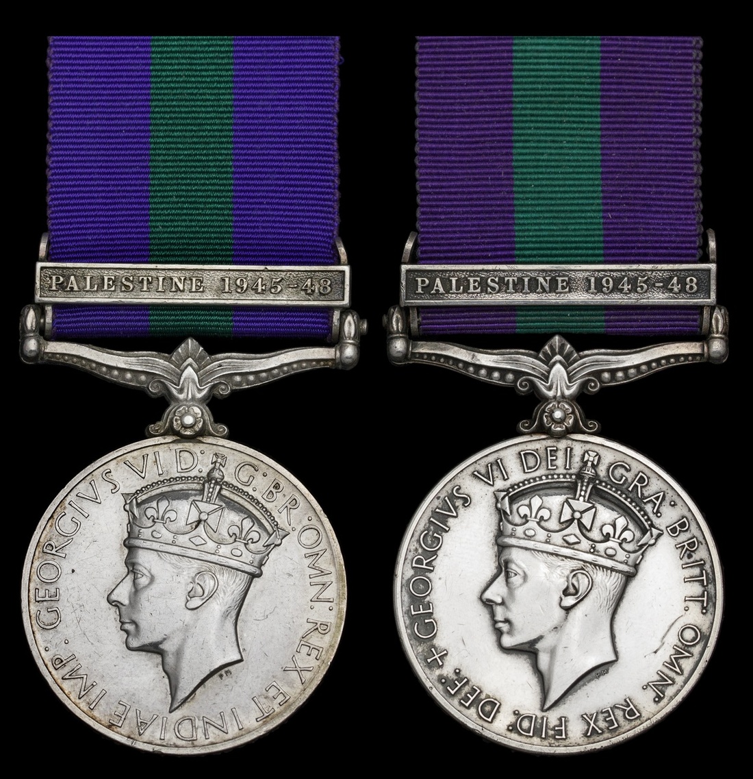 (x) General Service 1918-62, 1 clasp, Palestine 1945-48 (2) (T/930632 Pte. J. Livingston. R.A.S.C.; 14138256 Pte. J. Higgins. S. Lan. R.), contact marks and light polishing to both, otherwise very fine