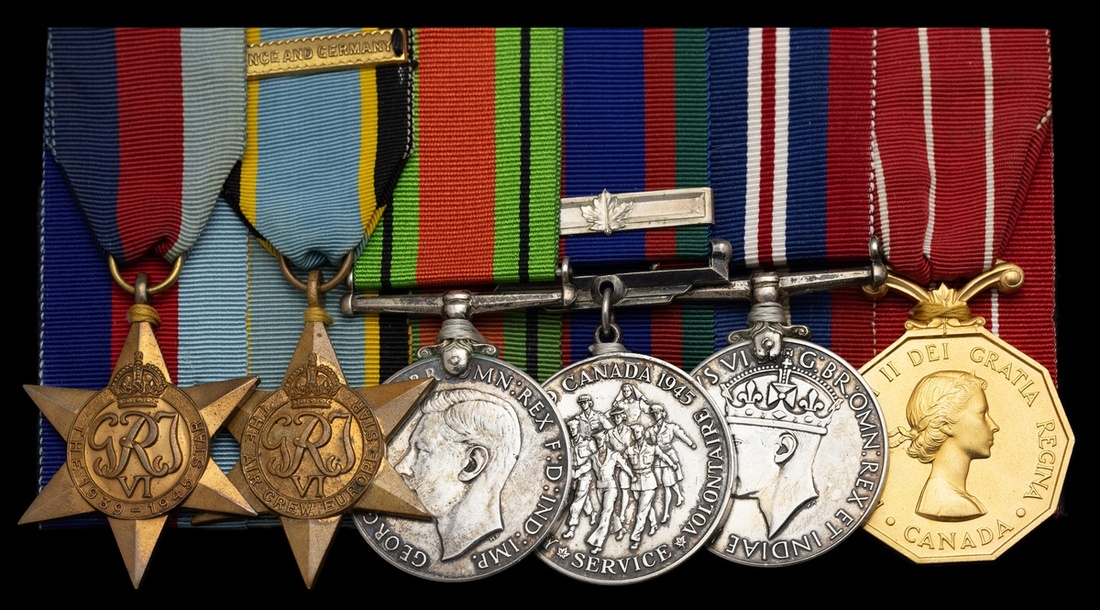 1939-45 Star; Air Crew Europe Star, copy clasp, France and Germany; Defence Medal 1939-45, Canadian issue; Canadian Volunteer Service Medal 1939-45 with maple leaf clasp; War Medal 1939-45, Canadian issue; Canadian Decoration, E.II.R. (F/L H. S. Rutter), mounted court-style for display, very fine (6)
