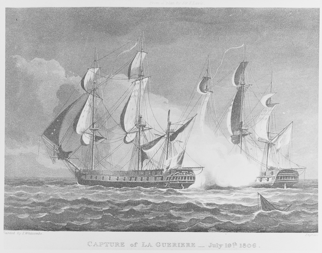 Lavie and Blanche were patrolling off the north-eastern coast of Britain with the objective of protecting merchant ships and trade routes from attack by French raiders and privateers when they received word of an enemy squadron in the area under orders for that very purpose. Sailing north from the Shetland Islands, on 18 July 1806 the French frigate Guerriere was spotted and Lavie made all sail to close with his opponent. The resulting battle was an exceptional result for the British captain and the men under his command: Guerriere failed to prepare for action (perhaps mistakenly believing the British frigate to be French), and by the time Guerriere began to fight back Blanche had already unleashed two broadsides into their opponent's hull. French gunnery appears to have been particularly bad on this occasion, not only did Blanche suffer minimal damage with a mere four men wounded, but conversely British gunnery was excellent, with Guerriere losing her mizzenmast in addition to having over fifty of her crew killed and wounded. Brought safely back to Britain, Lavie's reward was a knighthood and Guerriere was taken into the Royal Navy as H.M.S. Guerriere: she later met her end in a single-ship action against the famous American frigate U.S.S. Constitution.