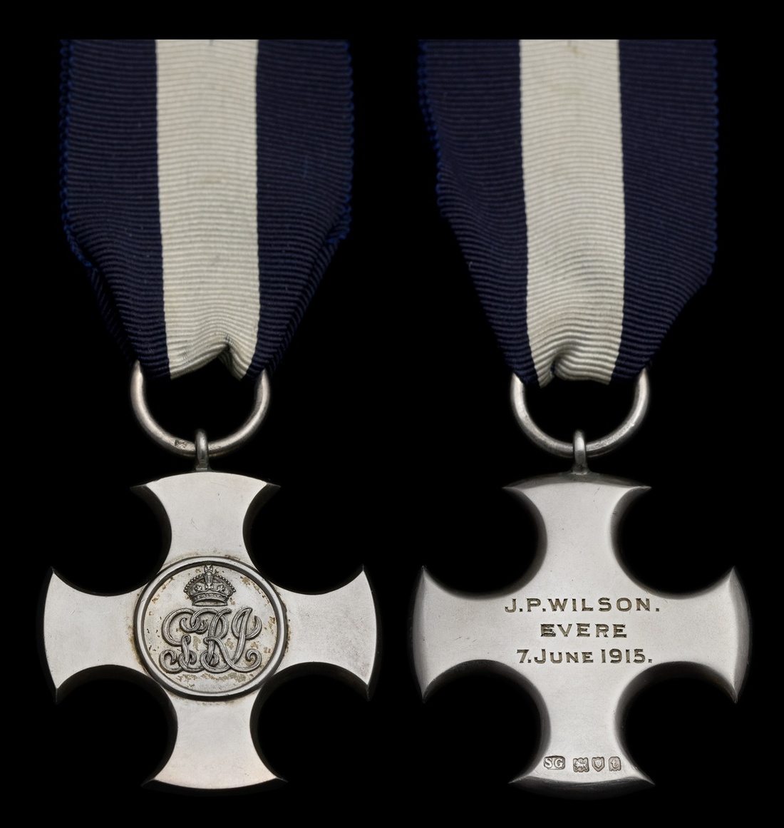 Distinguished Service Cross, G.V.R., hallmarked London 1914, engraved on the reverse 'J.P. Wilson. Evere. 7 June 1915'., very fine