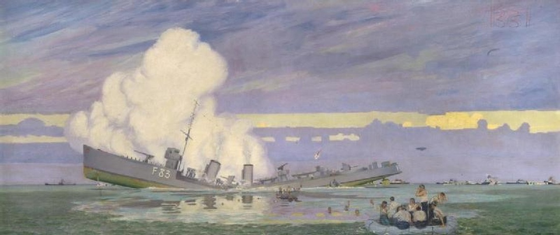 She was patrolling the North Sea on 15 August 1918 when a U-Boat, either U-71 or UC-17 torpedoed her amidships. The hit all but tore her in half and the sinking is immortalised in a painting by Charles Pears which hangs in the Imperial War Museum. Sandell survived the sinking and was posted to Swallow on 1 September 1918, remaining with her for the rest of the war and being discharged on 18 July 1919.