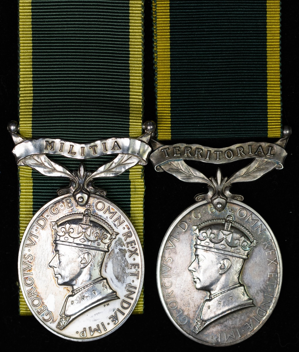 Efficiency Medal, G.VI.R., Militia (1465690. Gnr. J. Leslie. R.A.), mounted court style for display, contact marks, otherwise very fine (2)
