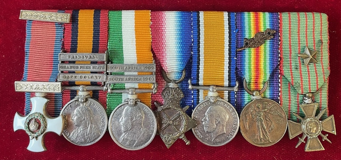 Distinguished Service Order, G.V.R., with integral top riband bar; Queen's South Africa 1899-1902, 3 clasps, Cape Colony, Orange Free State, Transvaal; King's South Africa 1901-02, 2 clasps, South Africa 1901, South Africa 1902; 1914-15 Star; British War and Victory Medals, with M.I.D. oak leaves; France, Third Republic, Croix de Guerre with star emblem, bronze, mounted court style as worn, some contact wear, overall very fine (7)