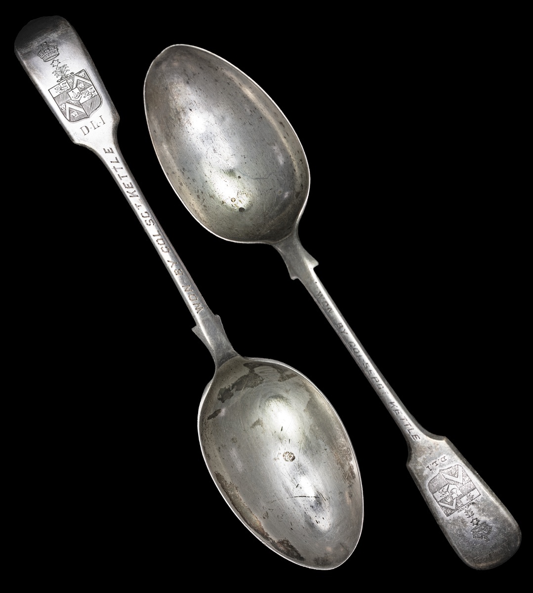 (x) A Pair of Silver Dessert Spoons, the handle engraved with Durban coat of arms with crown above and 'D.L.I.' (Durban Light Infantry) below, first by Saint Arnauld Creake for 1905 and the second by William James Dingley for 1906, both engraved on the stem to 'Colour Sergeant Kettle', in good used condition (2)