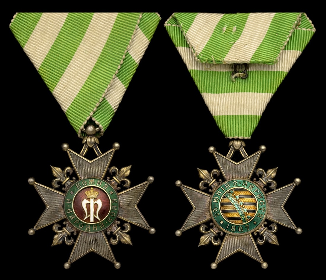 Bulgaria, Kingdom, Cross for the Election of Prince Ferdinand I, 1st Class breast Badge, 49mm x 42mm, white metal and enamel, good very fine, in its Rothe & Neffe, Wien case of issue