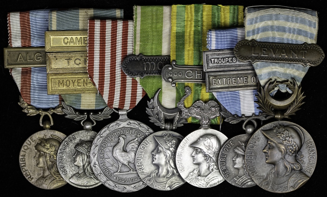 (x) France, Republic, China Medal, 1 clasp, 1900 Chine 1901, silver, marked 'Argent'; Morocco Medal, 1 clasp, Maroc; Levant Campaign Medal, 1 clasp, Levant, bronze; Colonial Medal, 1 clasp, Algerie; Italy Campaign Medal 1943-1944; Colonial Medal, 3 clasps, Moyen-Orient, Tchad, Cambodge; Colonial Medal, 2 clasps, Extreme Orient, Troupes Aeroportees, very fine (7)