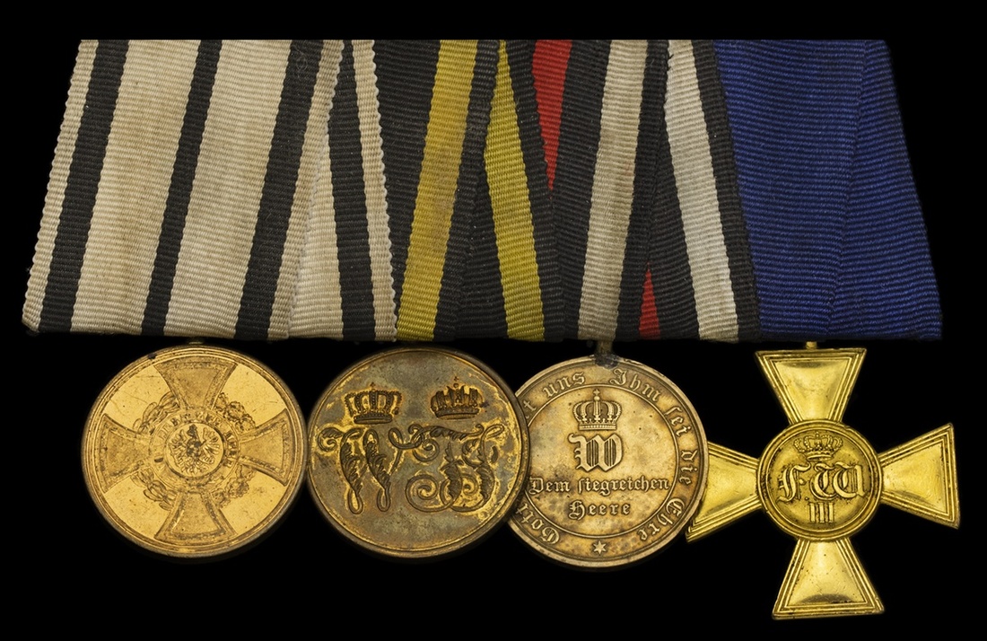 Germany, Prussia, Hohenzollern Campaign Medal 1848-9; Denmark War Medal 1864; War Merit Medal 1870-1, combat type, rim inscribed 'Aus Erobertem Geschuetz'; Military Long Service Cross for 25 years' service, mounted continental-style as worn, very fine (4)