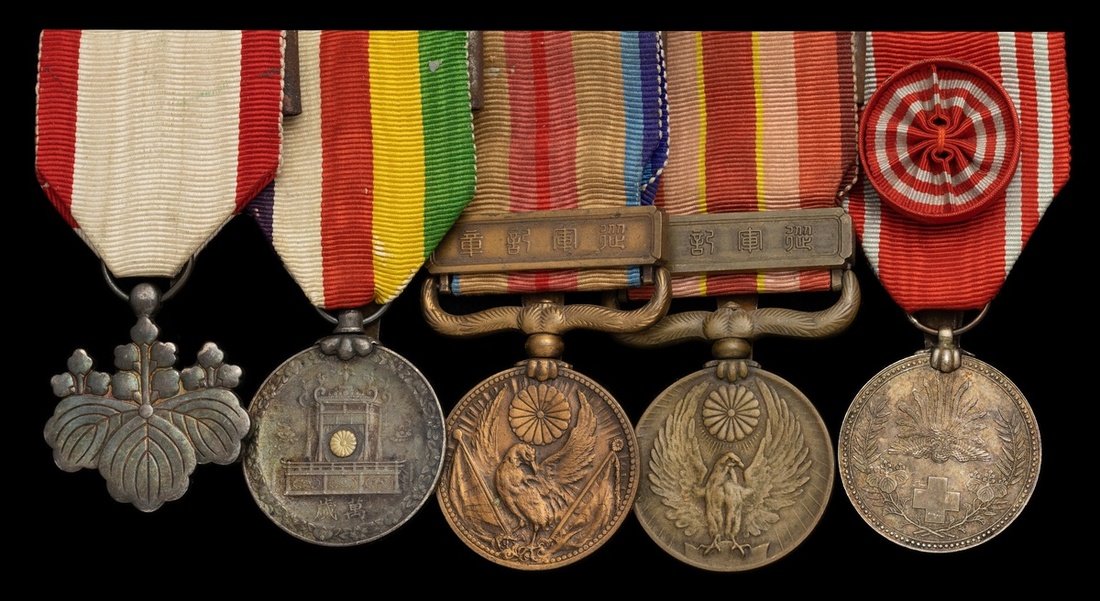 Japan, Empire, Order of the Rising Sun, 8th Class breast Badge, silver, with original riband; Showa Enthronement Commemorative Medal; China Incident Medal 1937; 1931-34 Incident War Medal, with clasp, bronze; Red Cross Decoration with rosette, silver membership, mounted as worn, good very fine (5)