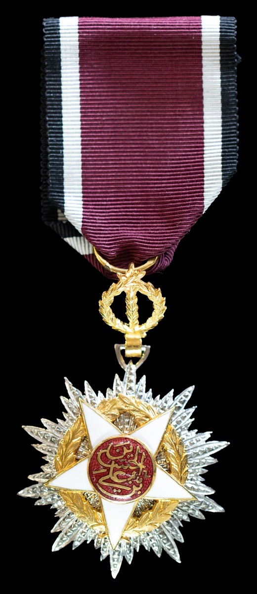 Jordan, Hashemite Kingdom, Order of Independence, 5th Class breast Badge, by Bertrand, Paris, 78mm including suspension x 38mm, silvered and gilded base metal and enamel, a few light scratches to enamel centre, otherwise very fine