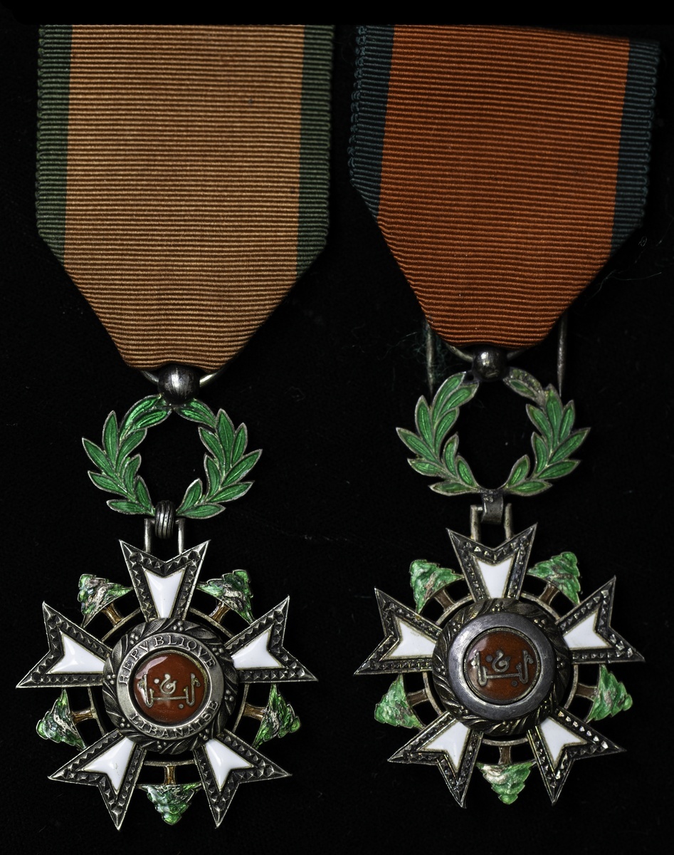 Lebanon, Republic, Order of the Cedar, 5th Class breast Badge, 1st Type with tricolour flag reverse, 1936-43; 5th Class breast Badge, 2nd Type with Lebanese flag reverse, 1943 onwards, by Bertrand, Paris, white metal and enamel, some wear and chipping to enamel, some enamel repairs, otherwise very fine (2)
